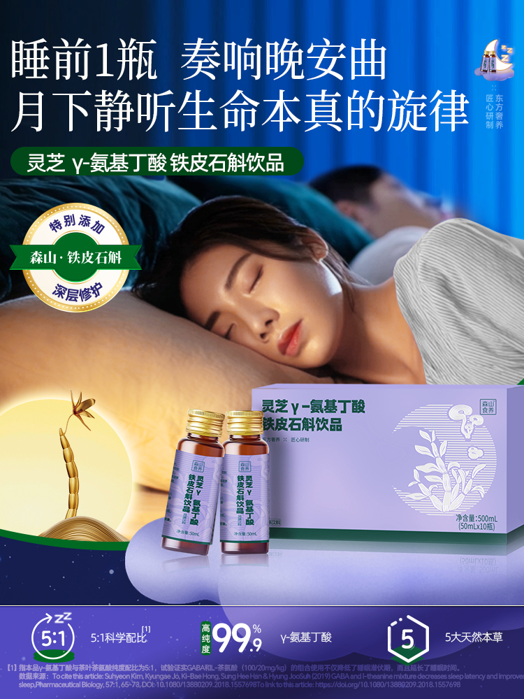 森山食养的一款灵芝γ-氨基丁酸铁皮石斛饮品在介绍中多次表示与睡眠相关。根据详情页面,“舒压助眠,酣睡整晚,睡前30分饮晚安更轻松。双重因子,强力助眠。5:1科学配比,打破入眠困境,降低睡眠潜伏期,延长睡眠时间。”