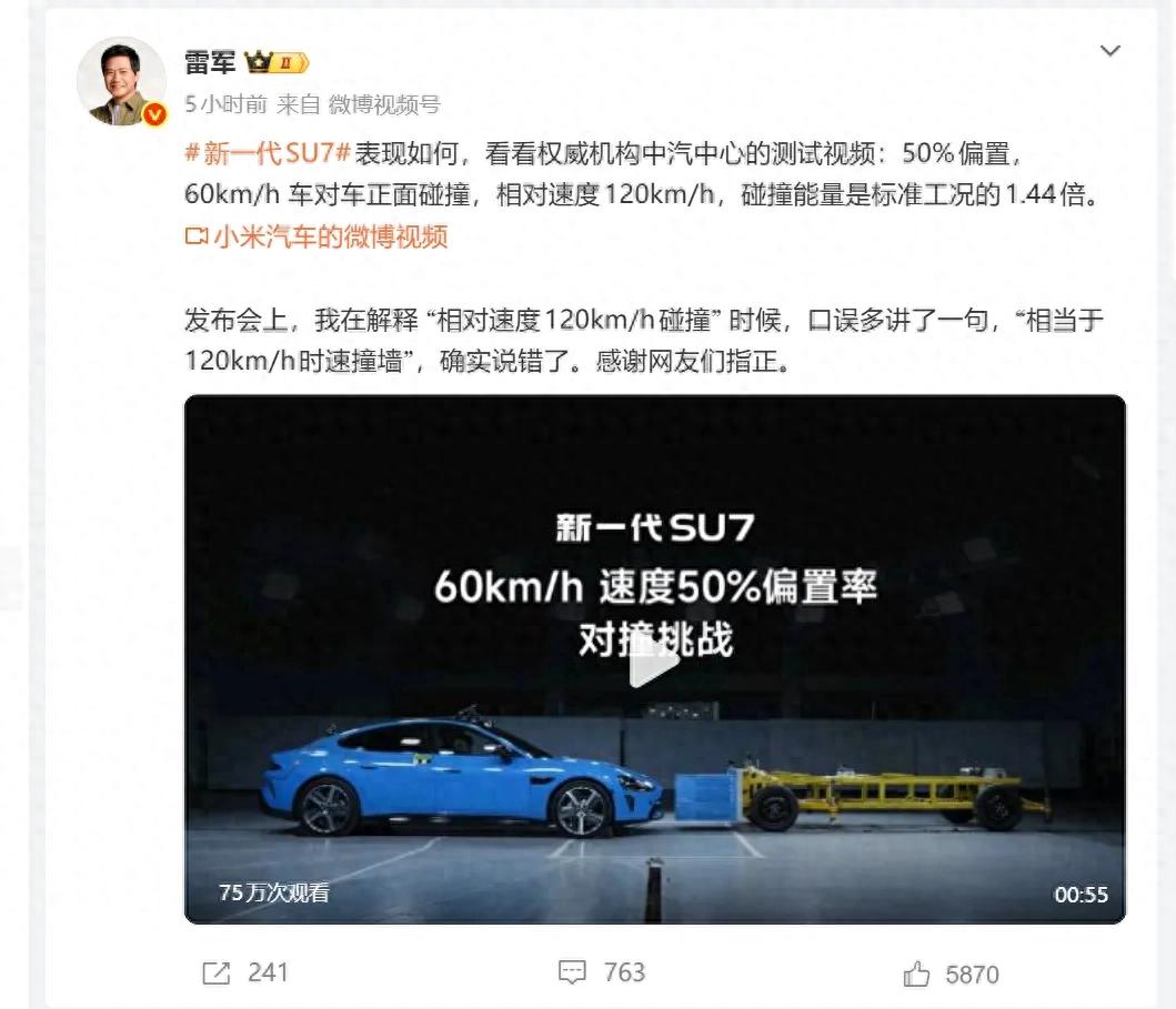 雷总在社交媒体上发文,承认自己在发布会上关于60Km/h对撞相当于120Km/h时速撞墙的说法是错误的。