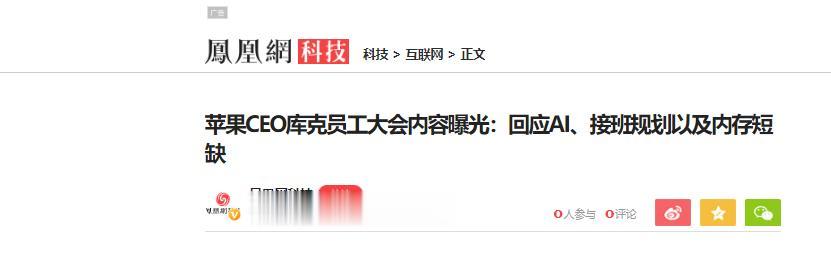 凤凰网科技:苹果CEO库克员工大会内容曝光:回应AI、接班规划以及内存短缺