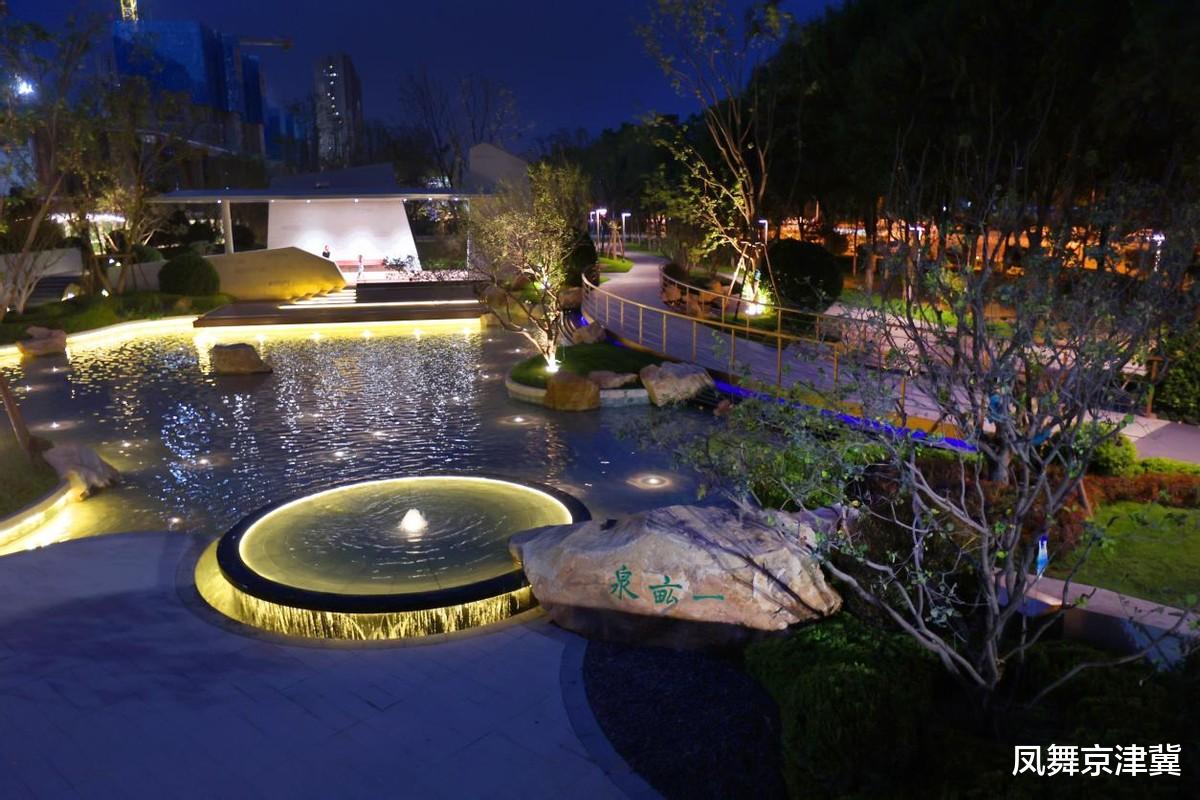 公园整体布局为“三大空间”:东侧观湖、西侧观山、中心迎宾归家。东侧以环形地铺模拟湖海浩瀚,中央圆形涌泉取一亩泉原型,象征生命与文脉生生不息;西侧观山区建有瞻岳阁,作为艺术空间,以逐级向上的设计实现 “登高望远”的意境,可感受太行山脉气势;中心区域的“西塘环清”水景由 324 块黑金砂花岗岩铺成,搭配苍劲迎客松,营造归家仪式感。
