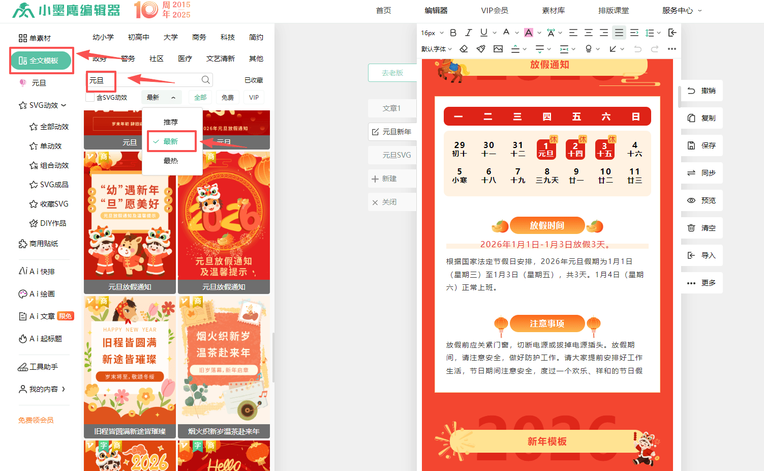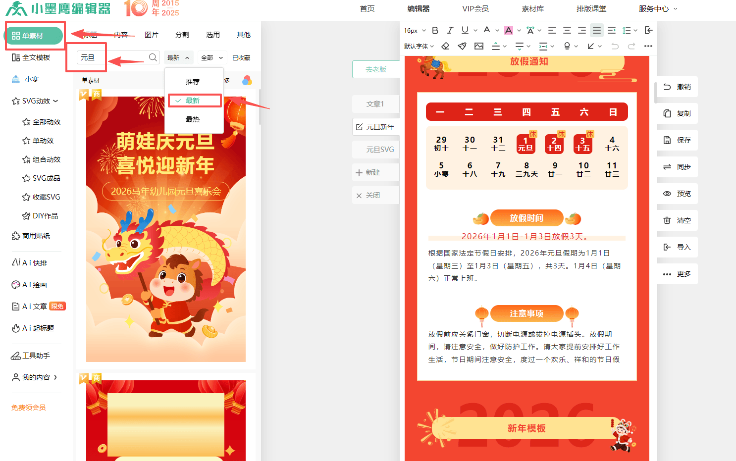 不管你在编辑器的哪个模块(单素材、全文模板、背景图),第一件事就是找排序方式。它通常藏在搜索框附近,是一个下拉列表。毫不犹豫地,把它从默认的“综合”或“热门”,切换成“最新”。这是解决问题的根本,一键让你进入“新品展示区”。