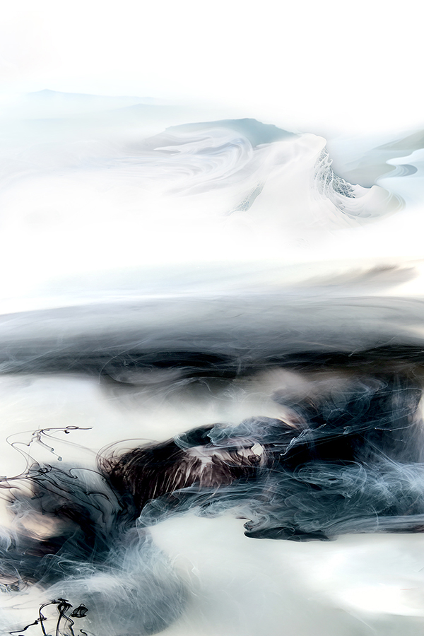 他将摄影对水中墨的“超然写实”与水墨的“物性氤氲”一同解构,转化为算法可处理的统一数据。然而,其目的并非再现,而是以算法的绝对理性,构建一个消解实相的数字空境。在《空山净》中,经摄影捕捉的水中之墨,最终在算法生成的虚空里流淌、消散。这是一种“基于精确的消解”——用最缜密的技术理性,搭建一座通往感性漫游与意境栖居的桥梁,从而构筑了一个可供感性无限漫游的“空”的场域。
