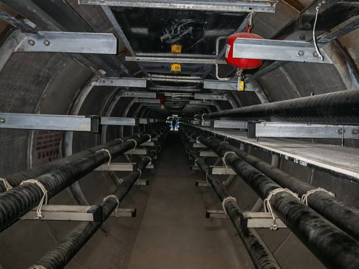放眼望去,两侧隧道壁上整齐排布着金属支架,粗如巨蟒的高压电缆蜿蜒横陈其上,中间只剩1米多宽的通道;200米外的隧道深处,像通往未知的黑洞;脚下的绝缘板踩上去弹弹软软,像走在水上的浮桥;而那些挂在顶部的红彤彤装置,乍看像新春的红灯笼,实际上是一个个灭火弹。