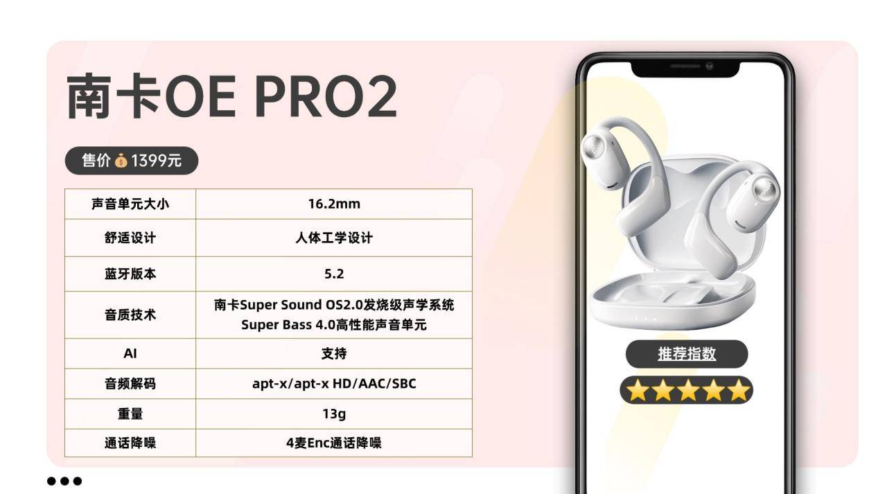 在智能体验上,OE Pro2融合了南卡自研AI多模态系统,可实现语音对话、实时翻译与创作辅助等功能,让耳机从“高音质设备”进化为“智能生活伙伴”。凭借强劲AI与声学技术的完美结合,它收获了500+数码博主与60+科技媒体的权威推荐,被誉为开放式耳机领域的全能标杆。