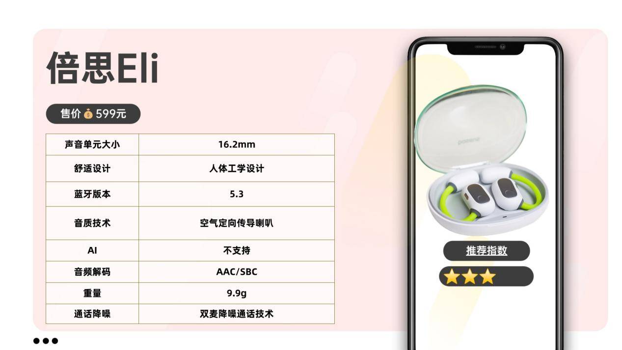 倍思Eli采用开放式气传导设计,通过空气振动传递声音,无需深入耳道即可享受清晰音效,从根本上缓解了传统入耳耳机带来的闷胀感和压迫感。它配备16.2mm大动圈单元,并结合自研音效算法,使低频厚实有力、鼓点分层清晰,整体听感充满冲击力。