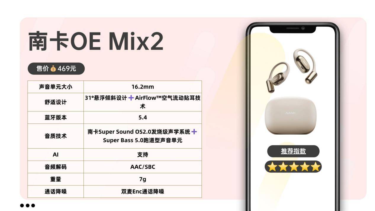 音质方面,南卡联合100+声学工程师与20多位发烧友 打造出Super Sound OS2.0声学系统,可智能调节声谱频率、自动补偿音质曲线。再配合全新Super Bass5.0跑道型高性能单元与6+3维空间音频技术,实现99.9%音质还原度,让声音层次更分明、细节更饱满,高频明亮、中频自然、低频浑厚,呈现出沉浸式立体听觉体验。凭借卓越表现,OE Mix2通过多家国际专业机构认证,并获500数码博主集体推荐,在业内几乎无可替代。