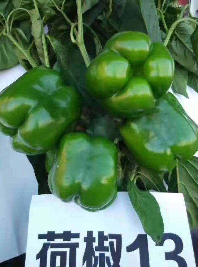 荷椒13——甜椒品种。一代杂交种,中早熟,大果型品种,果实方灯笼型。连续座果率高,四心室率高。果实整齐度高,味甜,果肉厚0.8厘米左右,果横径10-11厘米、纵径12-13厘米。果色较深绿,熟果转红色,果面光亮,单果重300-400克,最大可达600克左右。高产品种,抗病性强,适应性广。