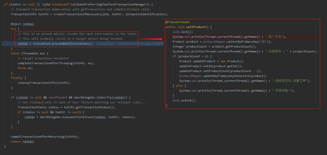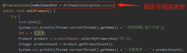 因为 sellProductBiz 抛出异常后,会调用 completeTransactionAfterThrowing 方法执行回滚逻辑。