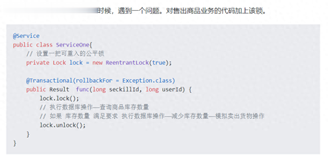 接着,为了解决并发访问的问题,他用 lock 把整个代码包裹了起来,保证在单体结构下,同一时刻只有一个请求能去执行减少库存,生成订单的操作。