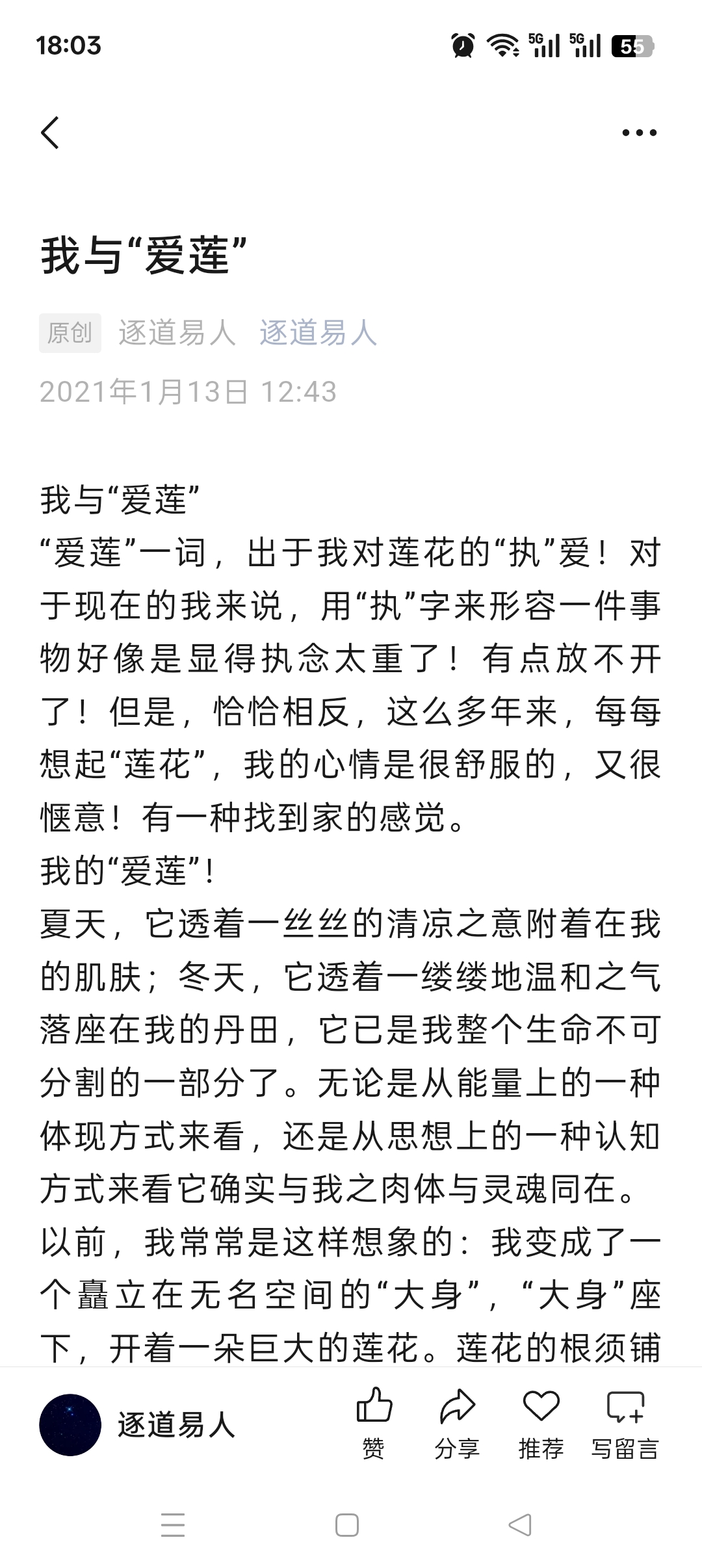 “爱莲”一词,出于我对莲花的“执”爱!对于现在的我来说,用“执”字来形容一件事物好像是显得执念太重了!有点放不开了!但是,恰恰相反,这么多年来,每每想起“莲花”,我的心情是很舒服的,又很惬意!有一种找到家的感觉。
