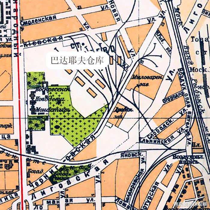 简单来说,巴达耶夫仓库就是列宁格勒火车站的中转货场,地点位于火车货运站的西边,占地约0.27平方公里,包含50多座木头建筑物(包括仓库和办公室)以及露天堆放场。该仓库最早建于1914年,由犹太商人拉斯捷亚耶夫出资建造。列宁格勒市内的货运有轨电车在1915年也铺设到了这里,该仓库迅速演变为重要的物资中转枢纽。1920年代,该仓库改名为巴达耶夫仓库。