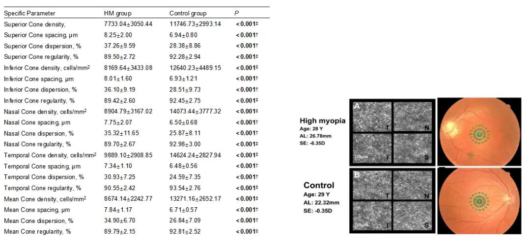 高度近视患者视锥细胞密度降低且规则度下降。高度近视组总体及四个象限的视锥细胞密度与规则性均较对照组显著降低,同时视锥细胞分散程度增加、间距增大(P均<0.001)。