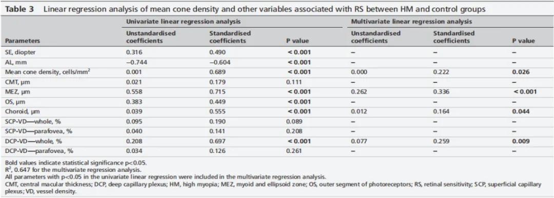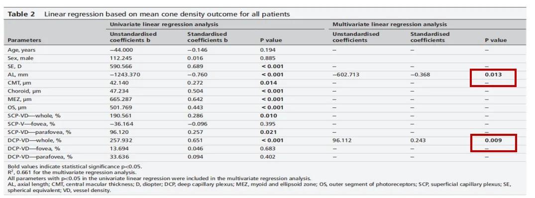 视锥细胞密度归因分析:多元回归分析表明,视锥细胞密度与眼轴长度呈负相关(P=0.013),与深层血管密度呈正相关(P=0.009)。