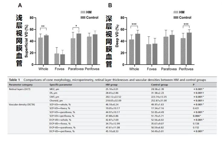 高度近视患者视网膜各层厚度显著变薄,视敏度显著下降。OCT参数显示,MEZ、OS、CMT及脉络膜厚度均较对照组显著变薄(P均<0.001);微视野检查提示高度近视组视敏度明显降低(P<0.001)。高度近视患者视网膜总体血管密度亦显著下降。其中浅层及深层总体血管密度均较对照组降低(P<0.01),深浅毛细血管丛的中心区与深层旁中心区血管密度差异无统计学意义。