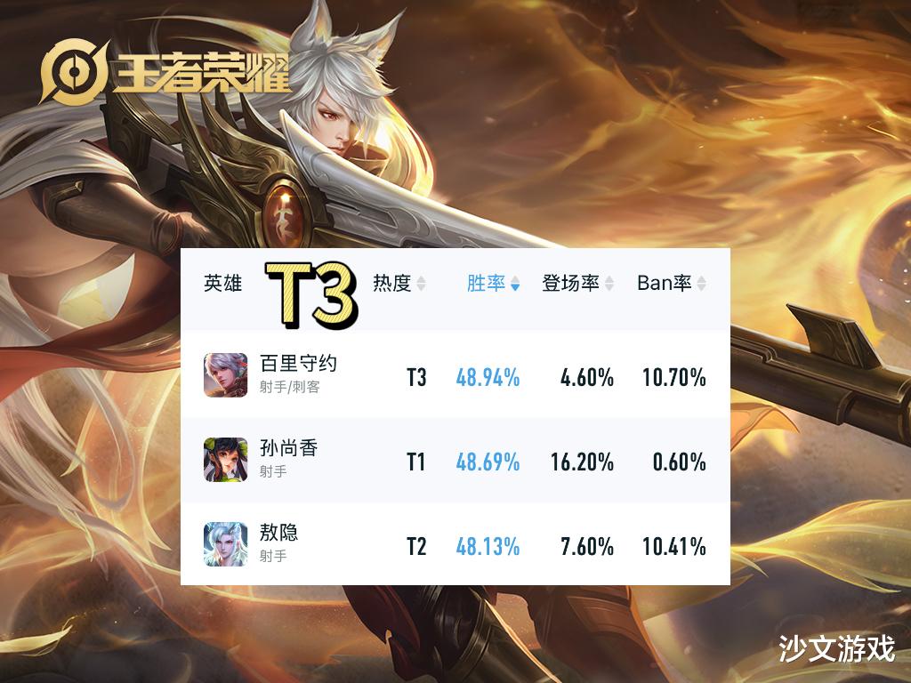 排在发育路胜率榜T3的英雄有百里守约、孙尚香、敖隐。这些英雄的胜率在48%至49%之间。