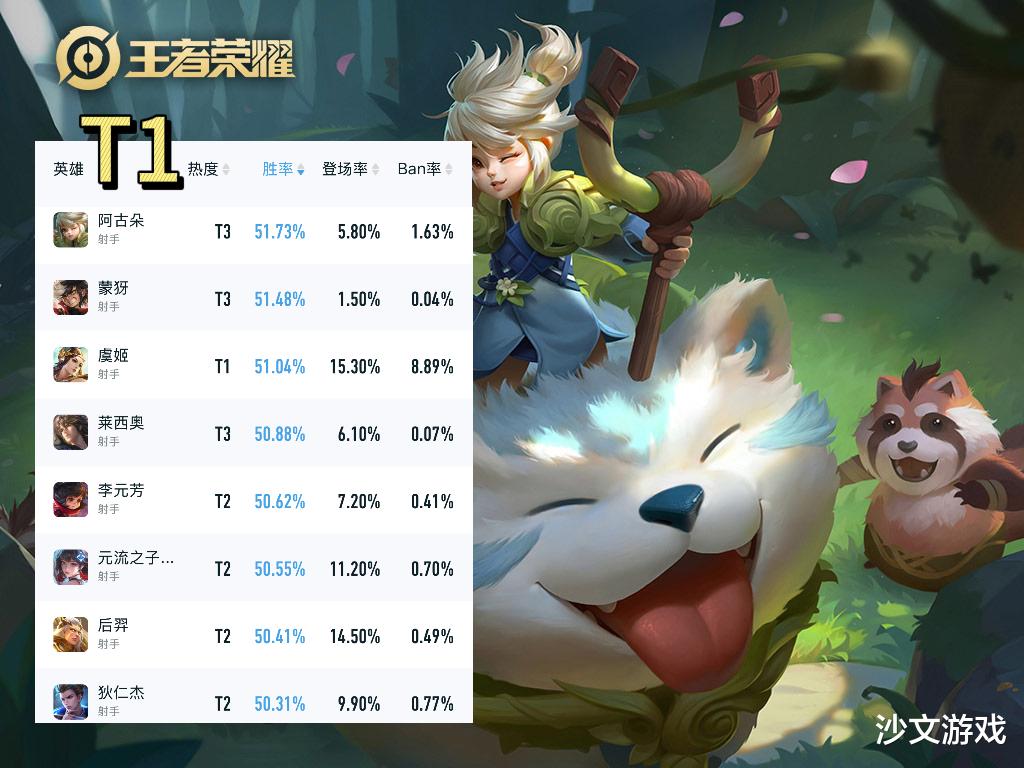 排在发育路胜率榜T1的英雄有阿古朵、蒙犽、虞姬、莱西奥、李元芳、元流之子(射手)、后羿、狄仁杰。这些英雄的胜率在50%至52%之间。
