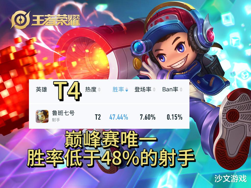 排在发育路胜率榜T4的英雄有鲁班七号,鲁班七号也是唯一一个胜率低于48%的射手。