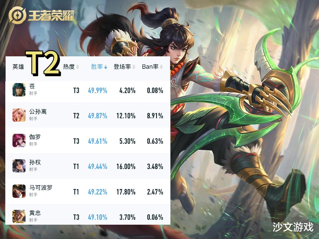 排在发育路胜率榜T2的英雄有苍、公孙离、伽罗、孙权、马可波罗、黄忠。这些英雄的胜率在49%至50%之间。