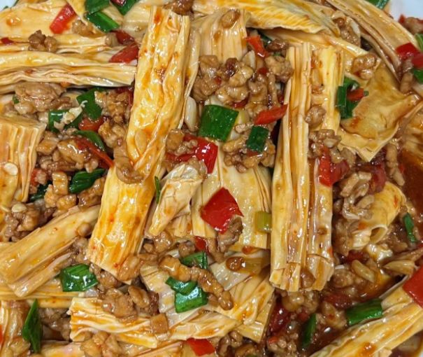 腐竹要选那种干透的,颜色淡黄,拿在手里轻飘飘的,一掰就脆断。提前两小时用温水泡上,不能图快用开水,外面烂了芯子还硬着,口感就差了。泡到腐竹通体柔软,捏起来像厚实的棉布,切成寸段,长短随意。肉沫选三分肥七分瘦的,纯瘦肉炒出来发柴,不够润。姜蒜拍碎剁细,蒜可以多些,重庆人做菜,蒜从来不小气。