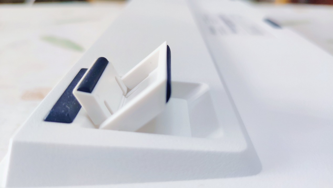 同时还配备了经典两段式脚撑,用以调整打字时键盘的倾斜度,和5排键帽倾斜度一样,均符合人体工程力学设计。调整好后,即使长时间打使用也不容易疲惫,手感相当不俗。