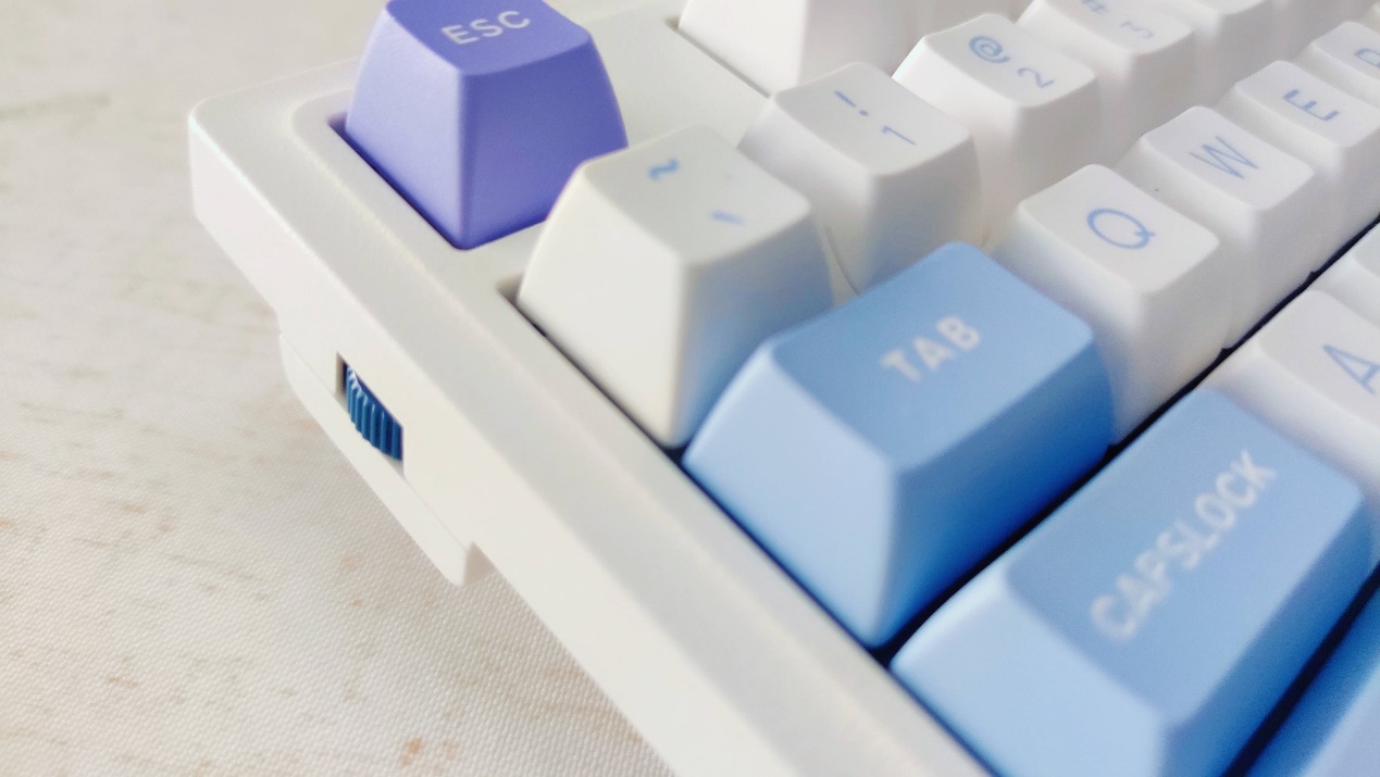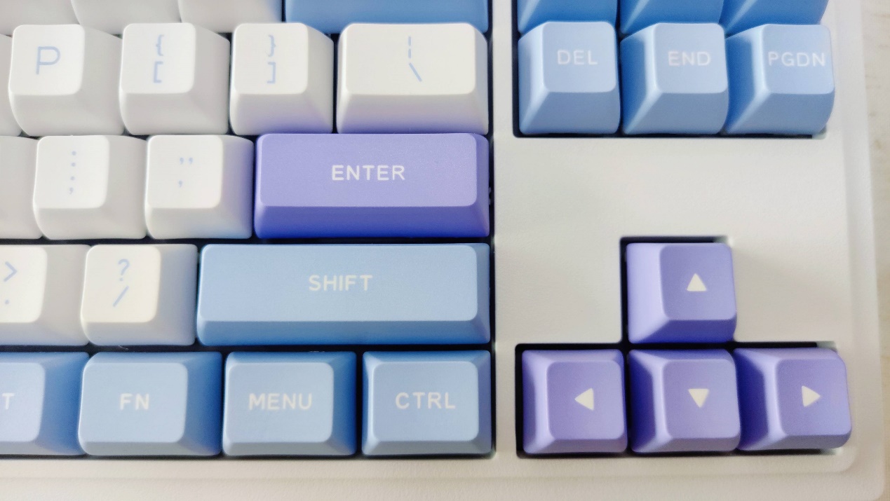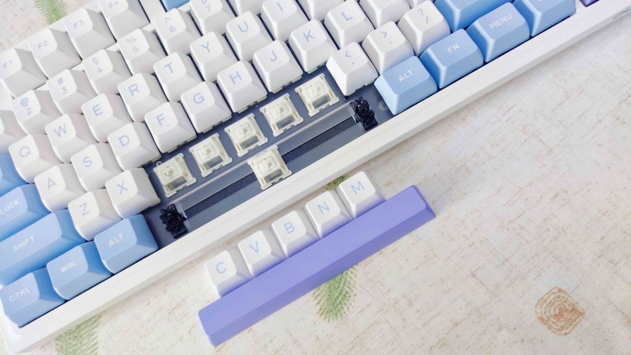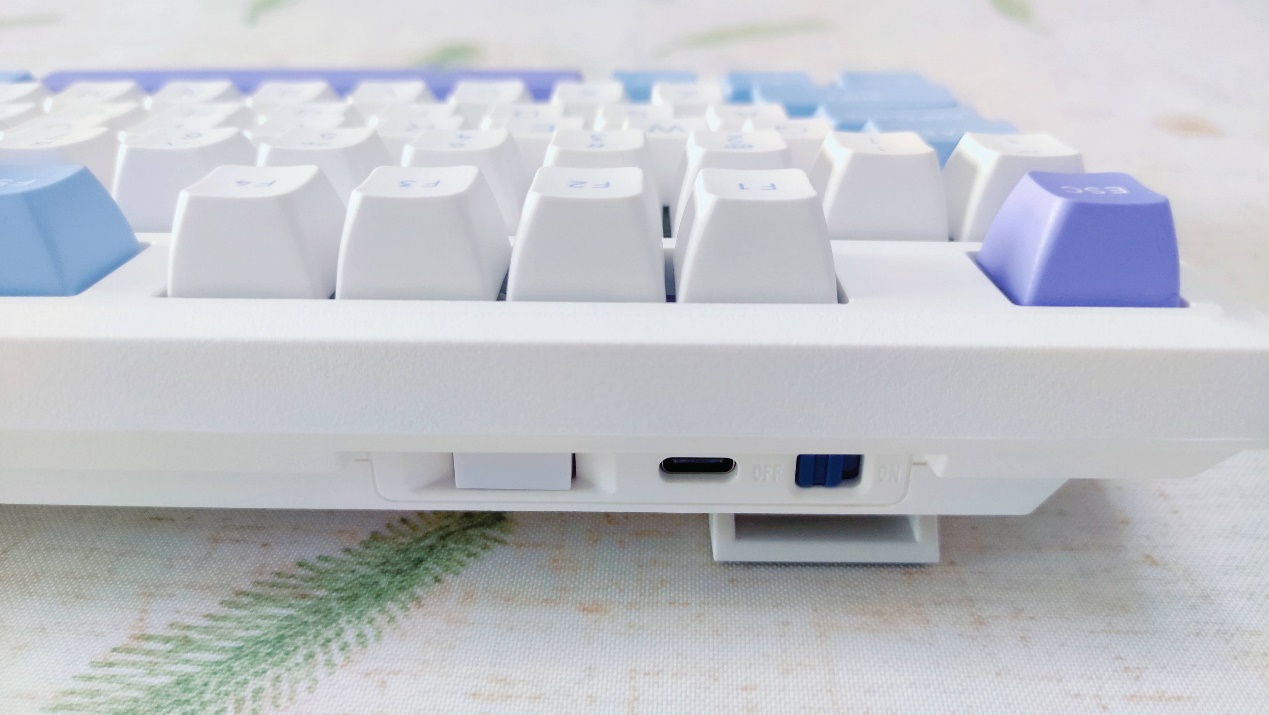 杜伽K100整体为白色,功能键选用粉蓝色、粉紫色,清爽的配色如同山谷间的轻风拂面似的,整体看上去俏皮可爱,就如同配色名“冰莓”一样。键盘上盖经过特殊漆面处理,凸显纹理感。