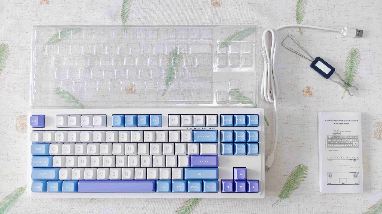打开包装后,取出键盘,还有用户文档、拔键拔轴二合一、USB数据线和透明防尘罩等配件。因为K100自带热插拔属性,所以二合一拔子也能发挥拔轴功能。