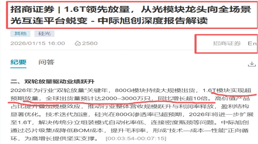 算力需求的旺盛必然会对光模块的需求极具增加。1月15日招商证券在中际旭创的路演会议表示,光通信从模块供应商向全场景光互连平台蜕变,技术架构从可插拔模块向光引擎、CPO、NPO、OCS等集成化形态演进。2026年为800G与1.6T放量元年。2026年为行业“双轮放量”关键年,800G模块持续大规模出货,1.6T模块实现超预期放量,全球出货量预计达2000–3000万只,同比增长超10倍。