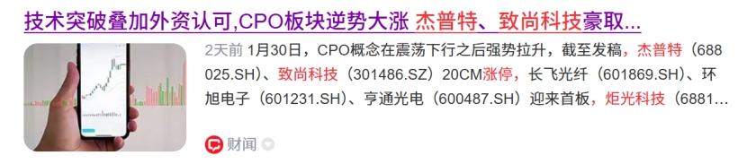 1月30日,光模块逆势大涨,杰普特、致尚科技20%涨停,炬光科技涨近17%续创新高,太辰光、天孚通信等涨超10%,新易盛涨近7%,中际旭创涨近6%。