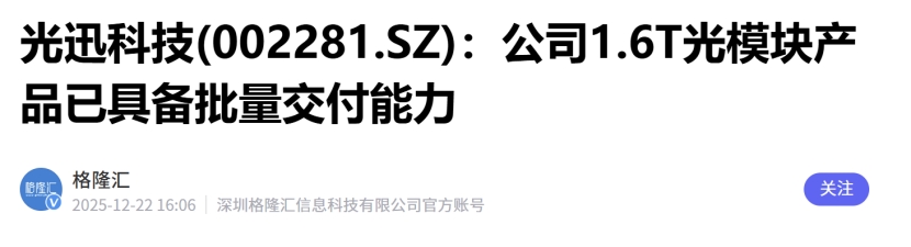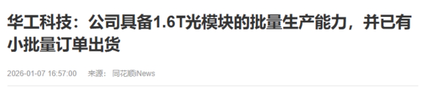 1.6T光模块量产能力:1月7日公司在投资者关系平台上表示,公司具备1.6T光模块的批量生产能力,并已有小批量订单出货。将充分受益于1.6T光模块需求10倍增长放量后带来的新增量