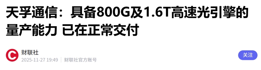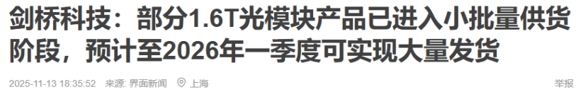 核心亮点:公司在宽带解决方案(XGS PON),综合光学与无线连接设备(OWOD)全球市占率均位居新列,全球率先开发800G/1.6T光槿块的厂商之一。1.6T光模块量产能力:公司在11月13日互动平台上表示,公司部分1.6T光模块产品已进入小批量供货阶段,预计至2026年一季度可实现大量发货。将充分受益于1.6T光模块需求10倍增长放量后带来的新增量