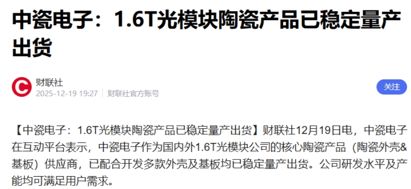 1.6T光模块量产能力:公司在互动平台表示,公司作为国内外1.6T光模块公司的核心陶瓷产品(陶瓷外壳&基板)供应商,已配合开发多款外壳及基板均已稳定量产出货。将充分受益于光模块龙头公司量产1.6T光模块带来的增量。