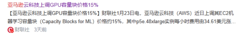 亚马逊云科技(AWS),近日上调其EC2机器学习容量块(Capacity Blocks for ML)价格约15%,其中p5e.48xlarge实例每小时费用由34.61美元涨至39.80美元。