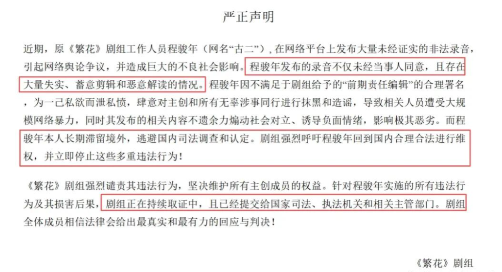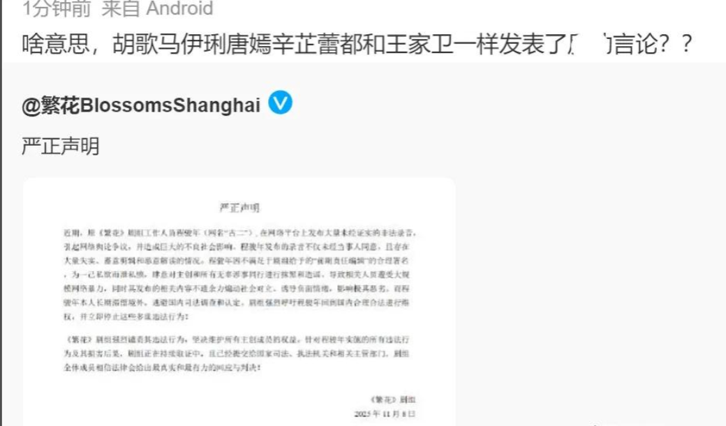 可《繁花》剧组的回应,堪称公关灾难。11 月 8 日发的声明,洋洋洒洒一大篇,核心就三件事:骂古二 “非法录音”“恶意剪辑”,说他 “滞留境外逃避司法”,最后还拉上 “剧组全体成员” 集体站队。