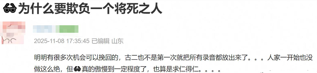 更讽刺的是,剧组在声明里骂古二 “逃避司法”,可自己却干着骚扰无辜老人的事。网友怒了:“人家身患绝症维权无门,你们倒好,欺负老人算什么本事?”“古二不回国太对了,连老人都敢骚扰,他回去能有好果子吃?”