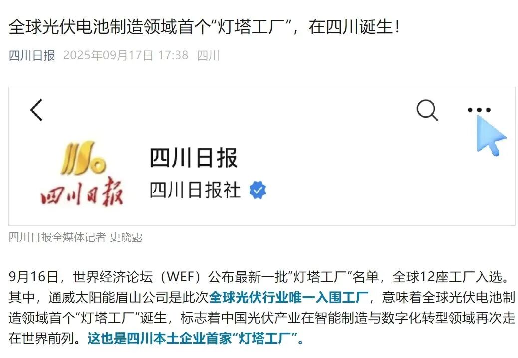 近期,世界经济论坛(WEF)公布新一批“灯塔工厂”名单,通威太阳能眉山公司荣耀上榜,成为全球光伏电池制造领域首个“灯塔工厂”,也是四川省本土企业首家获此殊荣者,这一消息迅速引发《四川日报》、《成都日报》、《眉山日报》及各行业媒体广泛关注与转发。
