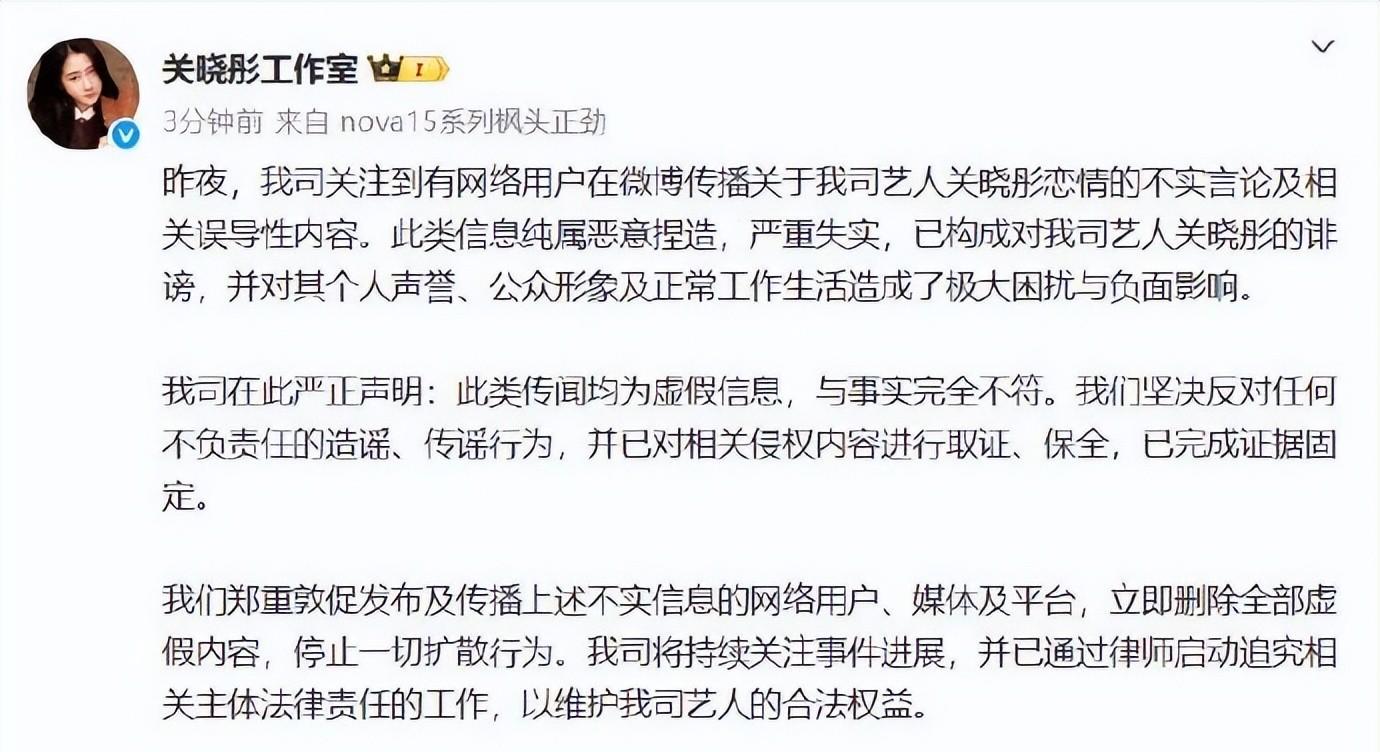 紧接着,关晓彤工作室也坐不住了,火速发布声明辟谣。方表示,昨晚网络上传播的恋情瓜纯属恶意捏造,严重失实。这波谣言给关晓彤造成了极大困扰,工作室同样已经完成了证据固定,并喊话造谣者立即删除虚假内容,否则法庭见。