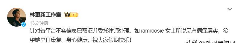 最让人哭笑不得的是林更新的回应。他的工作室在声明取证的同时,还不忘“损”一把爆料人:“如iamroosie女士所说患有病症属实,希望她早日康复。”这波回应既澄清了事实,又讽刺了造谣者可能精神状态不稳定,被网友戏称为“神补刀”。