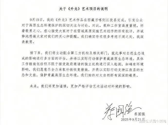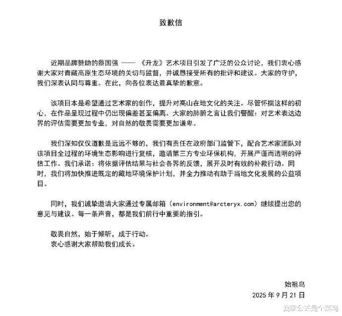 同日(9月21日),艺术家蔡国强也发布了致歉信,内容和版式都与始祖鸟大差不差。