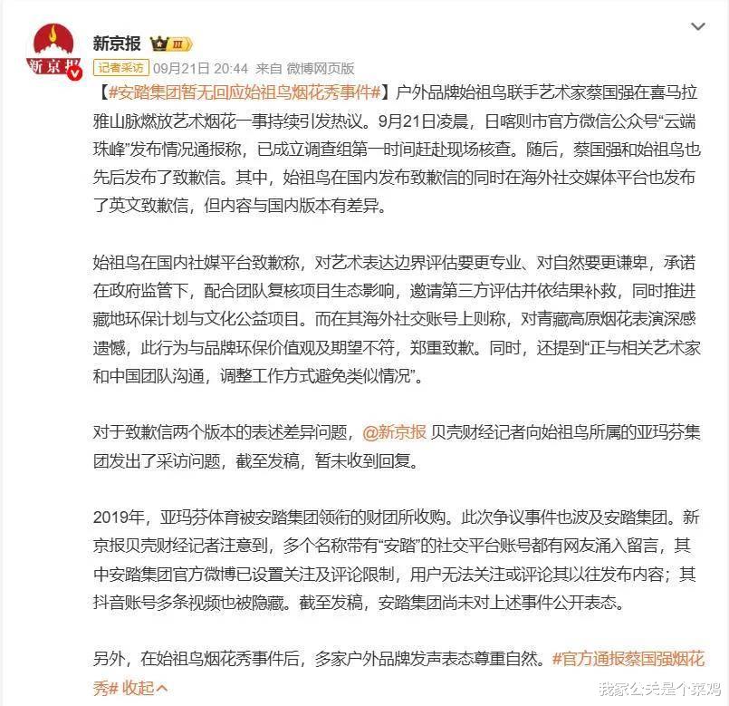 同日,多家媒体想要采访始祖鸟母公司安踏集团,均未收到回复,但“安踏集团暂无回应始祖鸟烟花秀事件”这一词条,依然上了热搜。