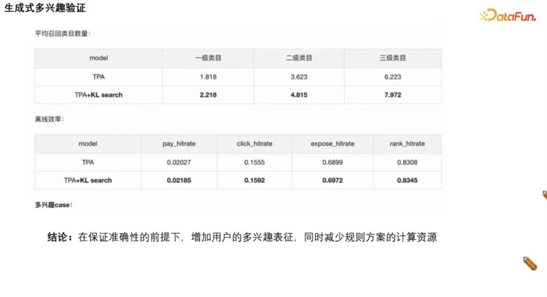 我们发现生成式多兴趣提升了类目宽度。同时,模型的准确性也有一定幅度的提升。这说明在保证准确性的前提下,增加用户的多兴趣表征,同时减少了规则方案的计算资源消耗。