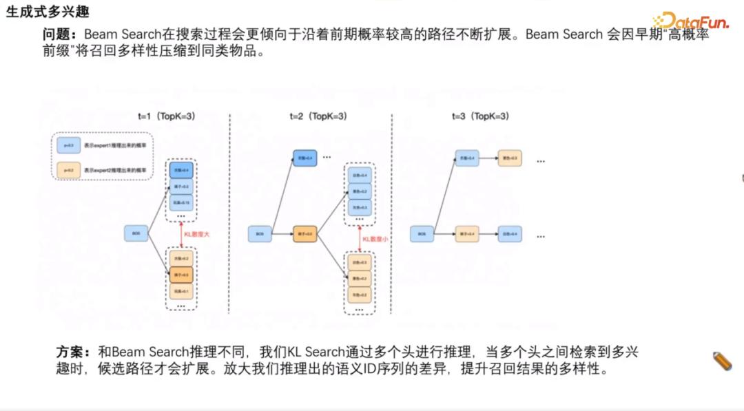 一方面,传统深度模型通过 poly encoding 或 dynamic routing 产生多个兴趣,这些方法在生成式框架下无法使用。因为生成式框架下通过 Beam Search 生成多个稀疏 ID,虽然可以通过温度系数等参数控制生成多样性,但它并非有序生成,无法保证正确性。因此,多兴趣生成需要兼顾多样性与准确性,而不仅仅是多样性。