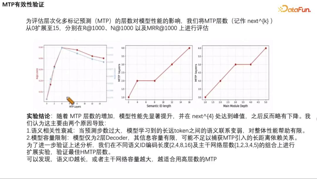 有效性验证为了评估层次化多标记预测对模型性能的影响,我们将预测步数从 1 扩展到 15,分别在 R@1000 和 MMR@1000 上进行评估。结果如下图左边所示,可以观察到明显的扩展性趋势:随着 MTP 层数的增加,模型性能先显著提升,并在第 4 个位置处达到峰值,之后略有下降。我们认为主要有两个原因:
