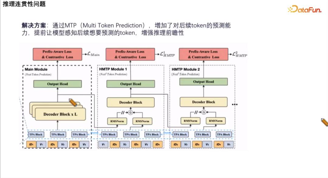 验证方法:为了评估 TPA 架构中前缀感知建模的效果,我们对模型微调前后的 Token 表征进行了对比分析。具体关注在不同商品之间,同一位置的 Token Embedding 的相似度变化,以及这种变化与前缀差异度之间的关系。验证结果:在未使用 TPA 的传统语义 ID 模型中,某一位置的 Token Embedding 是静态的,不依赖于前面的上下文信息。相比之下,引入 TPA 后,Token Embedding 变得前缀敏感,即使同一个 Token 出现在相同位置,其向量也会因前缀不同而变化。我们测量了在第 4、8、16 个位置处,不同前缀差异度下的 Token Embedding 余弦相似度。结果如上面图中所示,随着前缀差异度的增加,Token Embedding 的相似度单调下降。这说明 TPA 模块确实对 Token 表征进行了基于前缀的微调,前缀差异越大,Token 表示变化越明显,修正幅度也越大。这验证了 TPA 的核心设计假设,即前缀信息在建模层次化 Token 序列的语义表述中至关重要。通过引入前缀驱动的动态变化机制,TPA 能够生成更加精细且具有辨识度的 Token 表征。(2)推理连贯性问题:引入 MTP(Multi-Token Prediction)