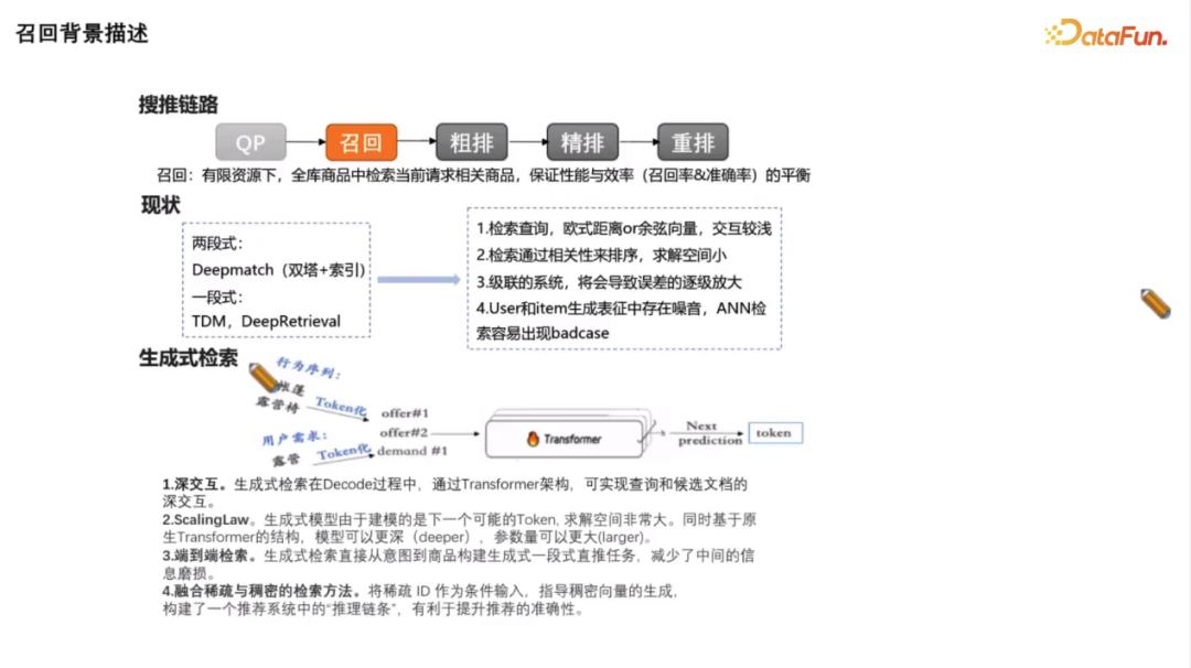 我们来看一下生成式召回的问题定义:召回任务是在有限资源的情况下,从全库商品中检索与当前请求相关的商品,以保证召回率与准确度的平衡。