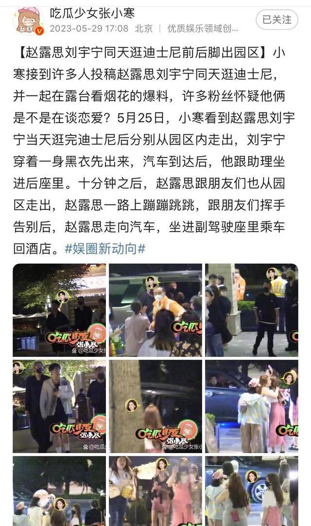 张小寒是收到很多人投稿,表示赵露思和刘宇宁同天逛迪士尼,怀疑两人是不是恋爱?
