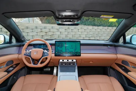 汉L EV的内饰采用的是T字型的设计布局,功能区域层次分明,比较容易上手,车厢内采用了棕色的主配色,但是在中控台上配备了带有淡紫色的贯穿式金属拉丝面板,兼顾了豪华感与年轻时尚风格,10.25英寸的全液晶仪表盘+抬头显示系统(HUD)能够提供丰富的行车信息,驾驶员可以根据自己的喜爱将常用的信息投射到前挡风玻璃上,避免了在行车过程中低头看仪表盘的不便,中控台则搭载的是一块带有DiLink车载智能系统的15.6英寸液晶大屏,智能化表现基本上和阿维塔 12保持在同一个水平。三幅式的多功能方向盘造型大小适中,采用的是皮质的材质,支持四向电动调节功能,并带有记忆和加热功能,换挡形式同样为电子式怀挡,手机无线充电功能也并未缺席,同时还带有原厂ETC功能,省去了后期加装的麻烦。虽然16个丹拿品牌的扬声器音效没有阿维塔 12的25个英国之宝音响的效果出众,但是也算符合这个价位级别车型的定位了。