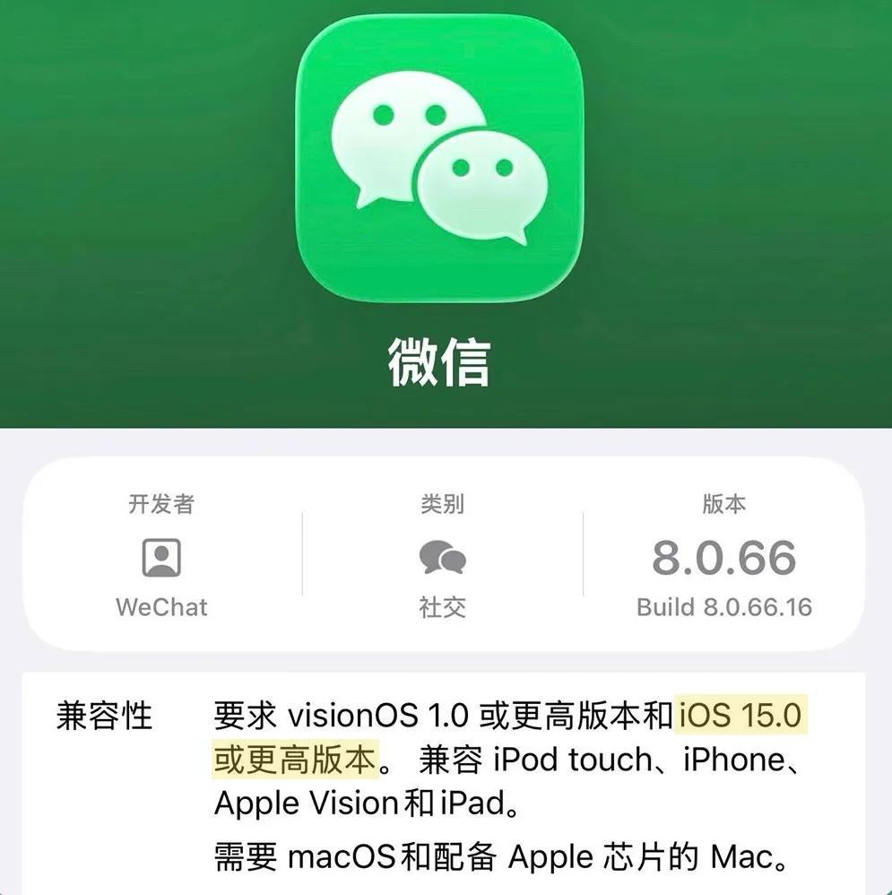 也就是说,如果你的iPhone系统在iOS 15以下版本的话,将无法更新微信到8.0.66内测版。