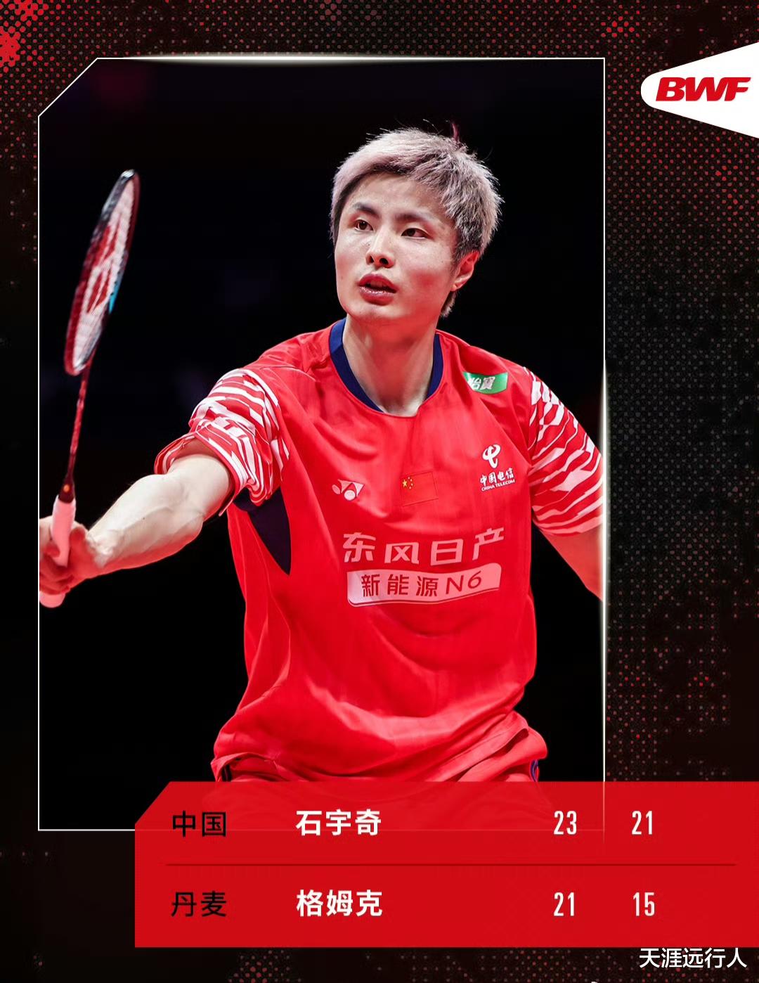 世界排名第一的石宇奇,以23-21, 21-15,力克丹麦球员格姆克,晋级男单16强,取得双方交手的七连胜,把两人之间的历史交手记录改写成8-1,下一轮静候刚刚拿下李梓嘉的印度小将阿尤什。
