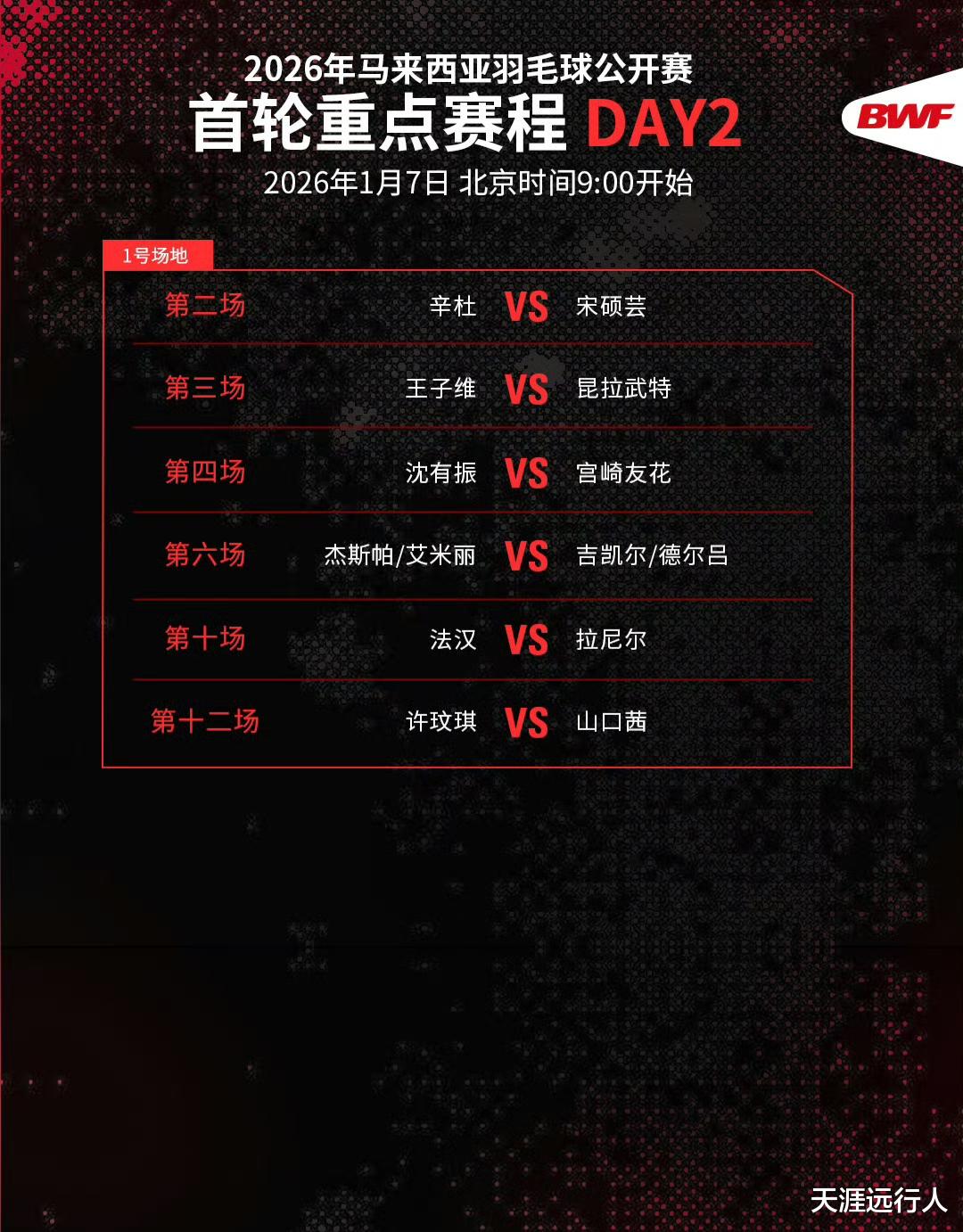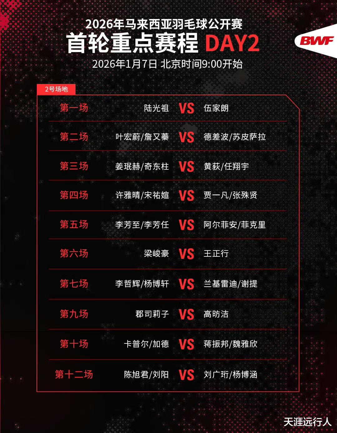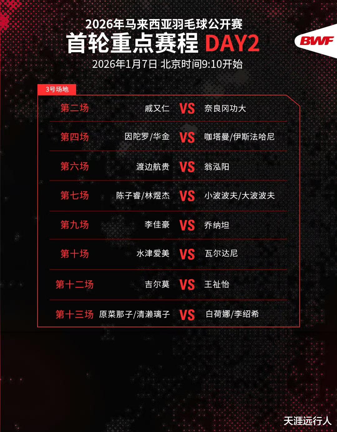 2026年马来西亚羽毛球公开赛 DAY2 首轮五个单项下半区国羽重点赛事赛程