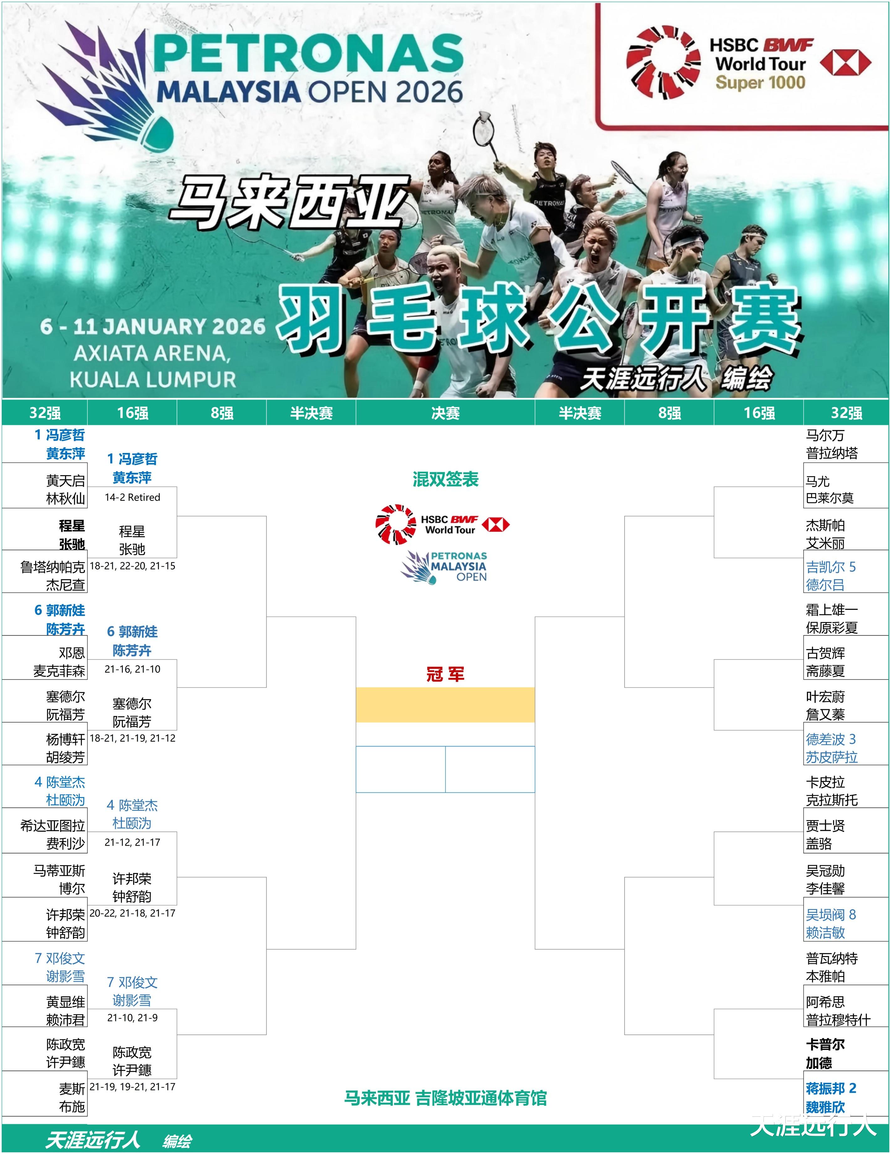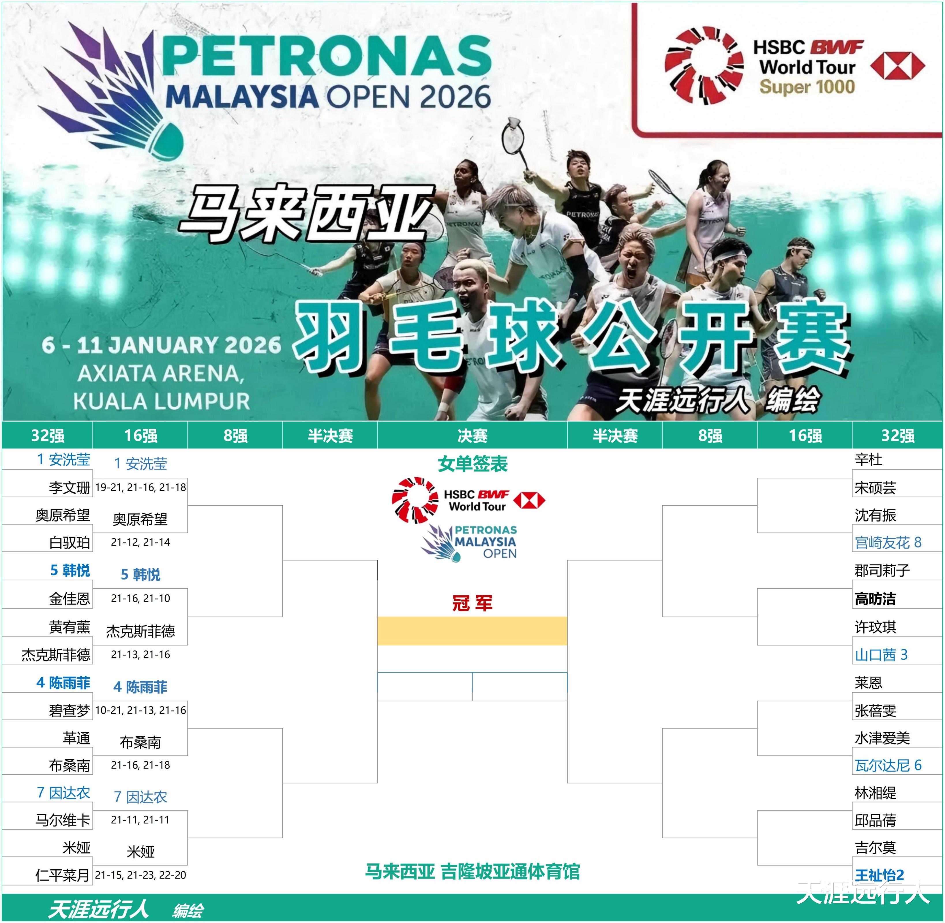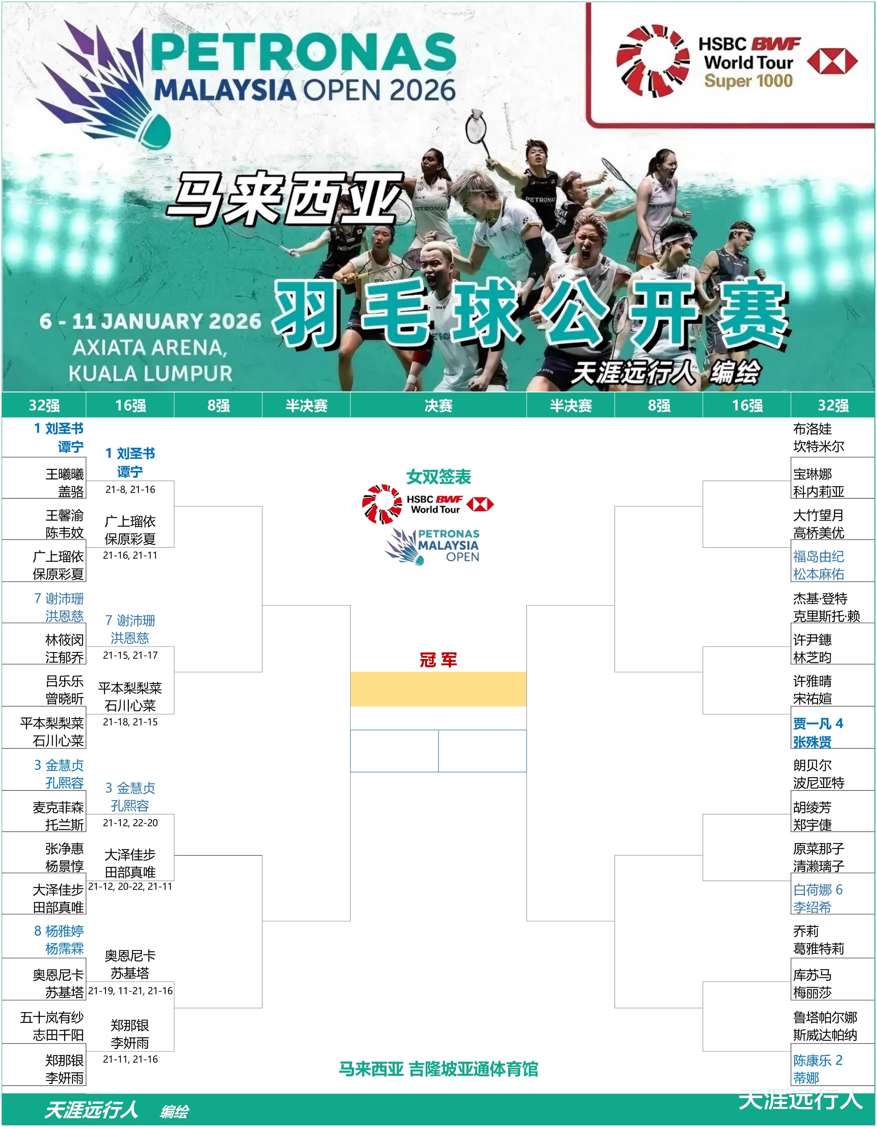 北京时间1月6日22时46分,世界羽联超级巡回赛2026年的首站比赛,超级1000级别的马来西亚公开赛首个比赛日,首轮1/16赛五个单项上半区的各八场角逐,全部决出了胜负。